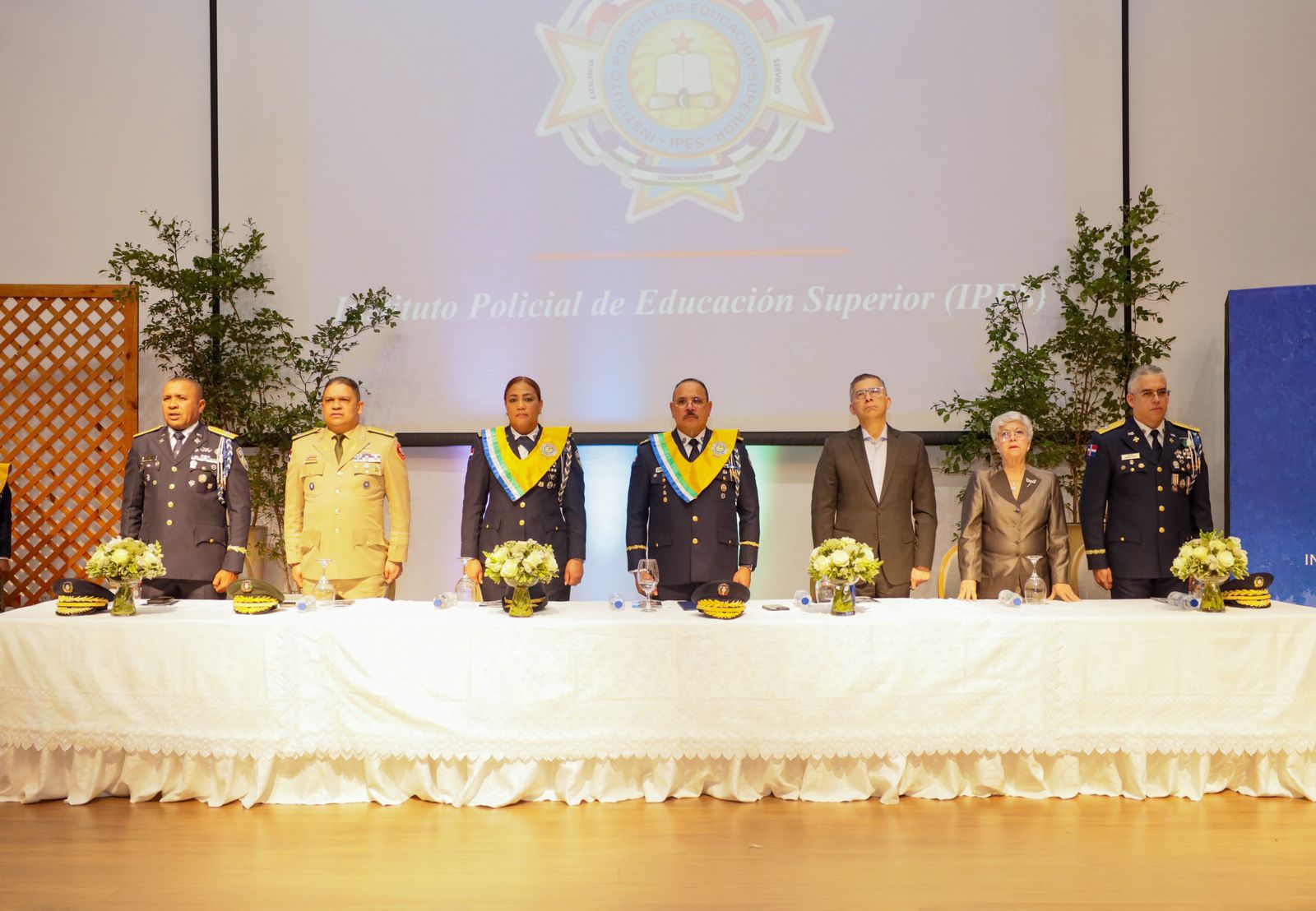 A éste le acompañaron en la mesa de honor, el mayor general Rafael Vásquez Espínola, rector de la Universidad Nacional para la Defensa (UNADE); el general Esteban Figuereo García, director de Recursos Humanos de la Policía; el general Werner Núñez Quezada, director de Asuntos Internos; la coronel Aída María Valdez Liranzo, rectora interina del IPES, y Melba Barnett en representación de Mukien Adriana Sang Ben, coordinadora de la Unidad de Modernización Educativa y Desarrollo Humano.