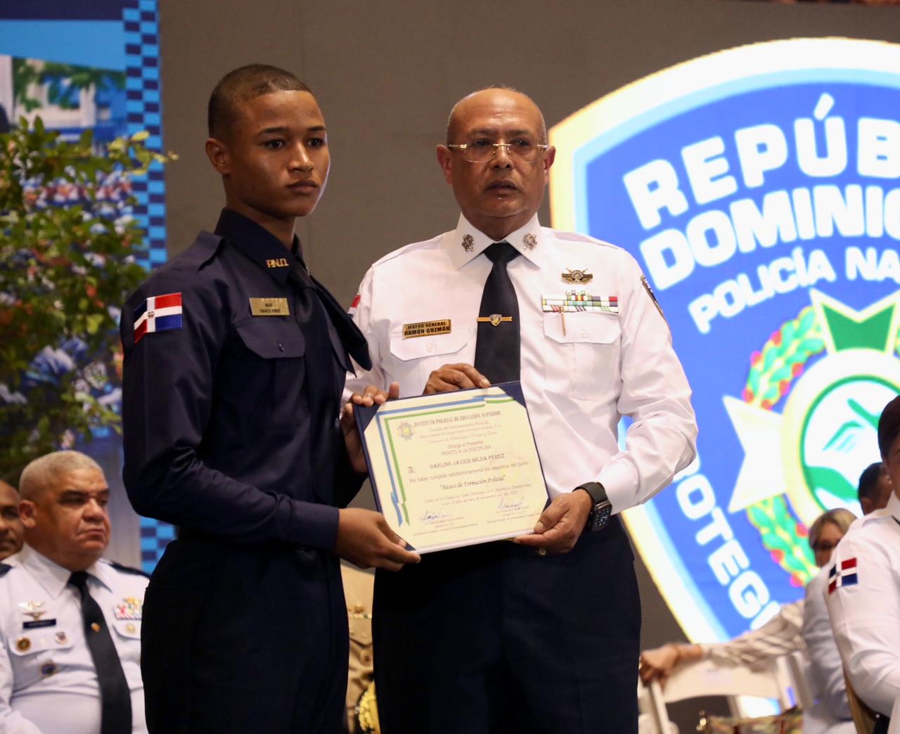 De igual forma, el mayor general Ramón Antonio Guzmán Peralta, director general de la Policía Nacional, entregó placas de reconocimiento a los graduandos destacados de la promoción 147 “Hermanas Mirabal” del Campus Gaspar Hernández: Josué De los Santos Campusano (mérito al conocimiento), Samuel David Fernández Féliz (mérito a la disciplina), Luis Manuel Guzmán Delgadillo (mérito al espíritu policial) y Darling Javier Mejía Pérez (mérito al concepto del deber).